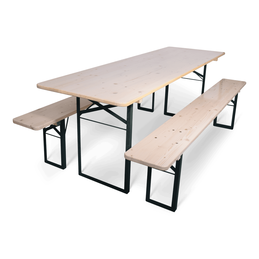 Wil je ‚m gebruiken als picknicktafel of terrastafel? Een biertafel kan op veel verschillende manieren worden ingezet. De meeste mensen kennen de biertafels van de Oktoberfesten. Met veel mensen aan lange tafels, zingen en biertjes drinken. Tegenwoordig worden ze ook veel gebruikt op festivals en bedrijfsfeesten. Ze nemen niet veel ruimte in beslag maar kunnen wel veel mensen, drankjes en eten kwijt. Makkelijk te plaatsen en op te ruimen dankzij het click & go systeem. Onze biertafelset bestaat uit 1 biertafel en 2 bierbanken. Het frame is van groen gelakte, stalen profielen. Het blad is van grenenhout, TÜV en PEFC gecertificeerd. De hoogte van de tafel is 78cm en het blad heeft een dikte van 25mm. De bierbank is 48cm hoog en heeft een dikte van 28mm. Sterk genoeg dus om er op te dansen. Wanneer is jouw volgende feestje?